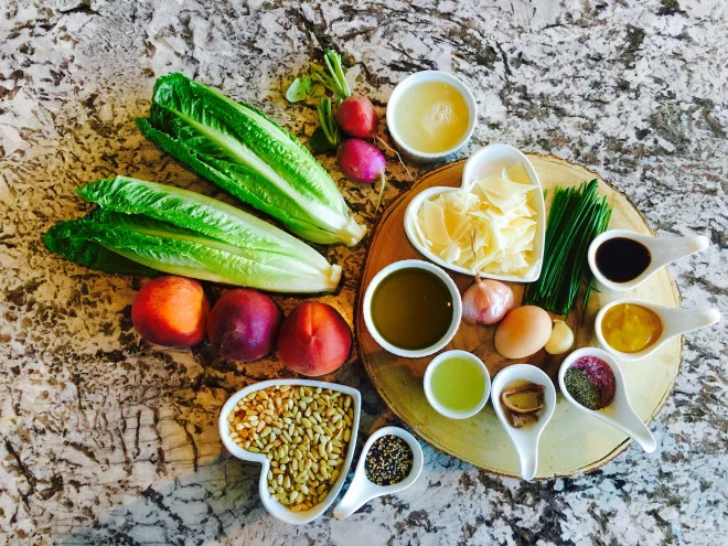 Present the Romaine in your large dish. Sprinkle with the egg whites. Then the pine nuts, if you are using them. Pour the dressing and then decorate with he grilled peaches.