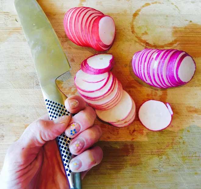 Slice the radishes.